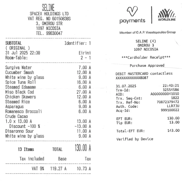 At the end of the night, we paid our bill in full, minus the cost of our complimentary desserts (as seen on our bill above), and only then did we mention to Costas that we were checking out Seline for Share Cyprus.